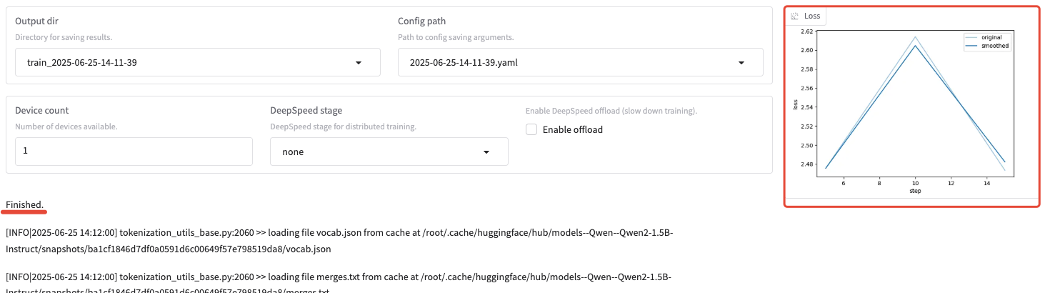 等待 5-10 分钟,微调完成后,你可以在界面上看到 loss 曲线。