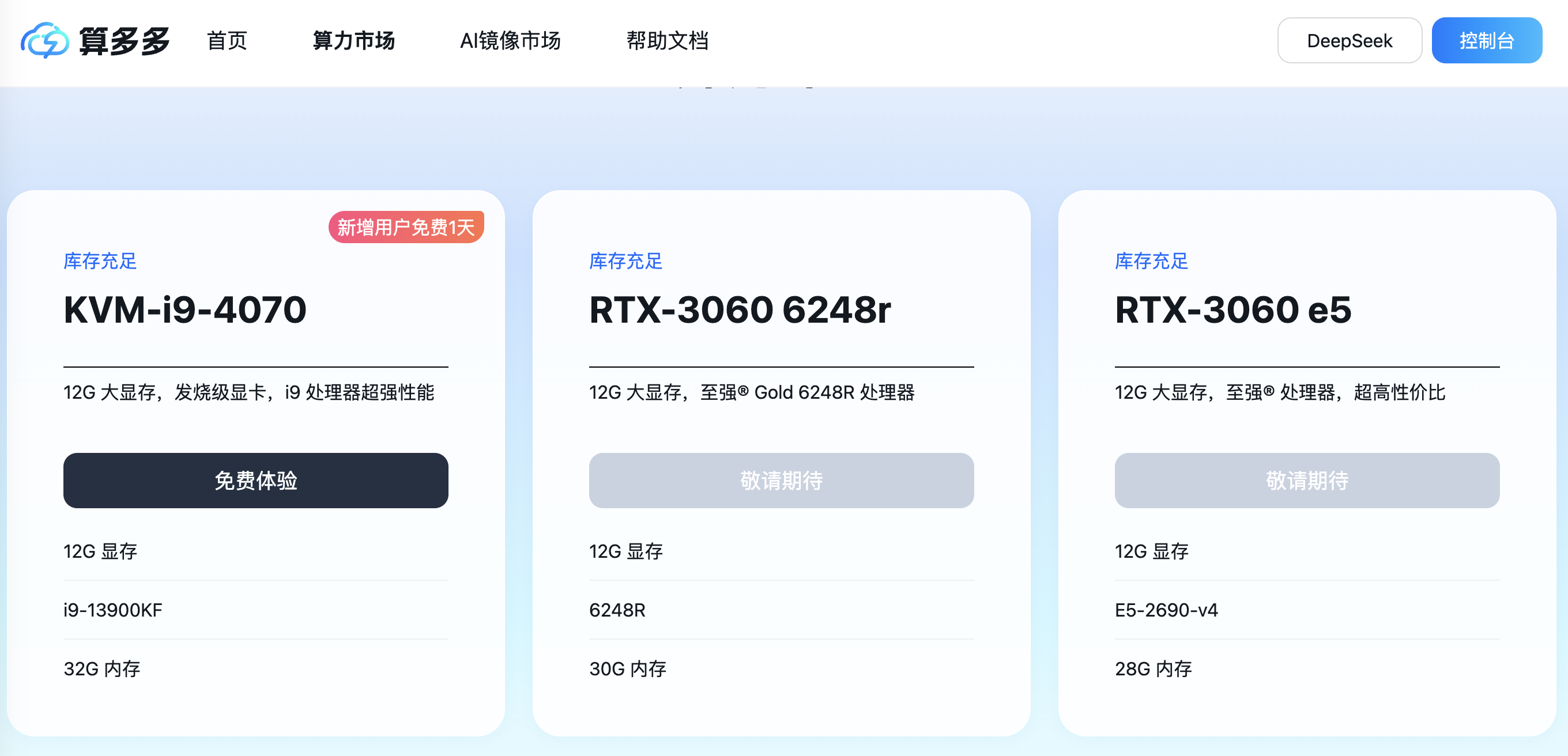 目前市面上很多算力平台都提供了免费试用的云服务器,一些新的小平台赠送的免费额度还挺可观的(比如趣算云、算多多、恒源云、智星文、damodel等),我这里以算多多为例。