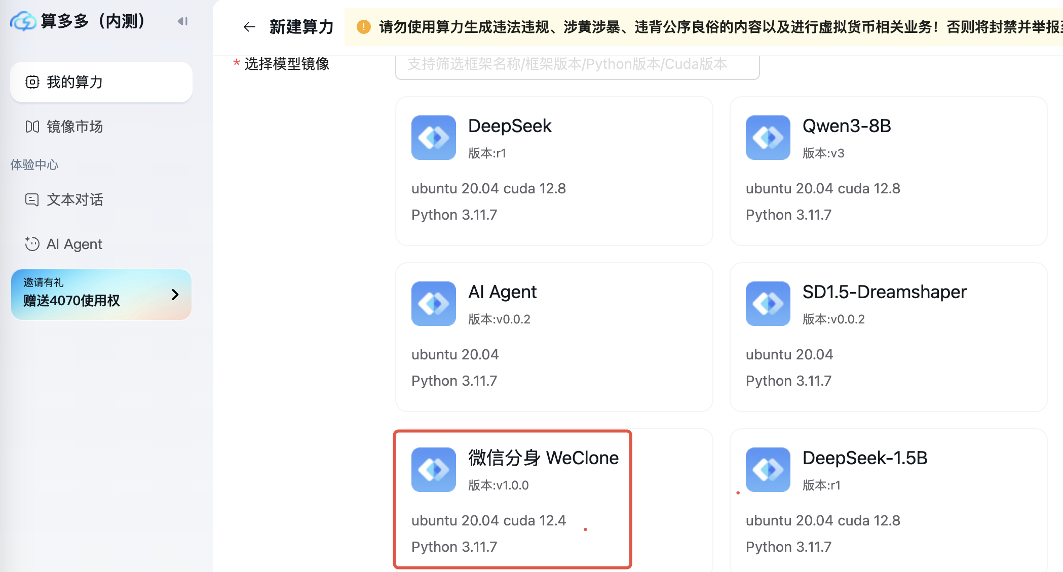选择Weclone 镜像,这个镜像包含了依赖的 LLaMA Factory 库、Qwen2.5-7B 模型、CUDA等。