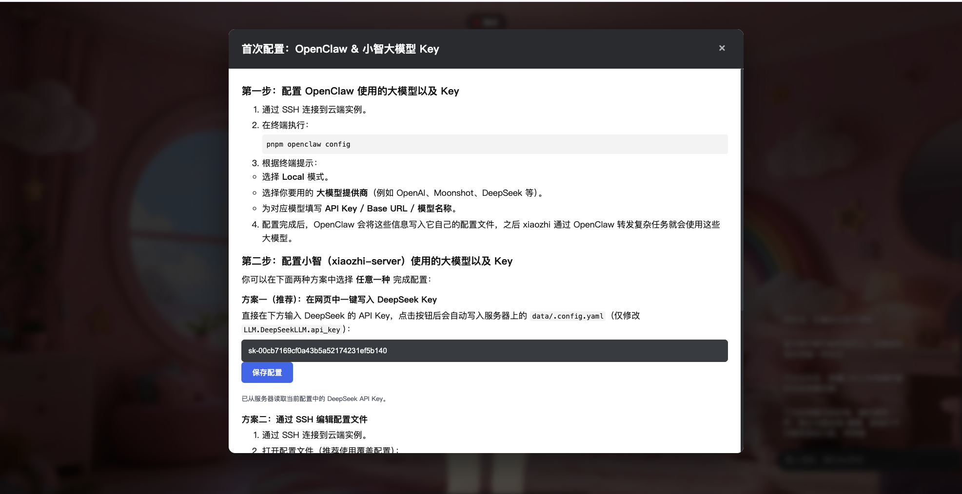 需要配置 OpenClaw 和 xiaozhi 的大模型,OpenClaw 是通过终端命令配置,xiaozhi 是通过直接修改文件配置(我在前端做了个快捷修改的入口,xiaozhi 修改完之后要手动重启一下 xiaozhi-server)